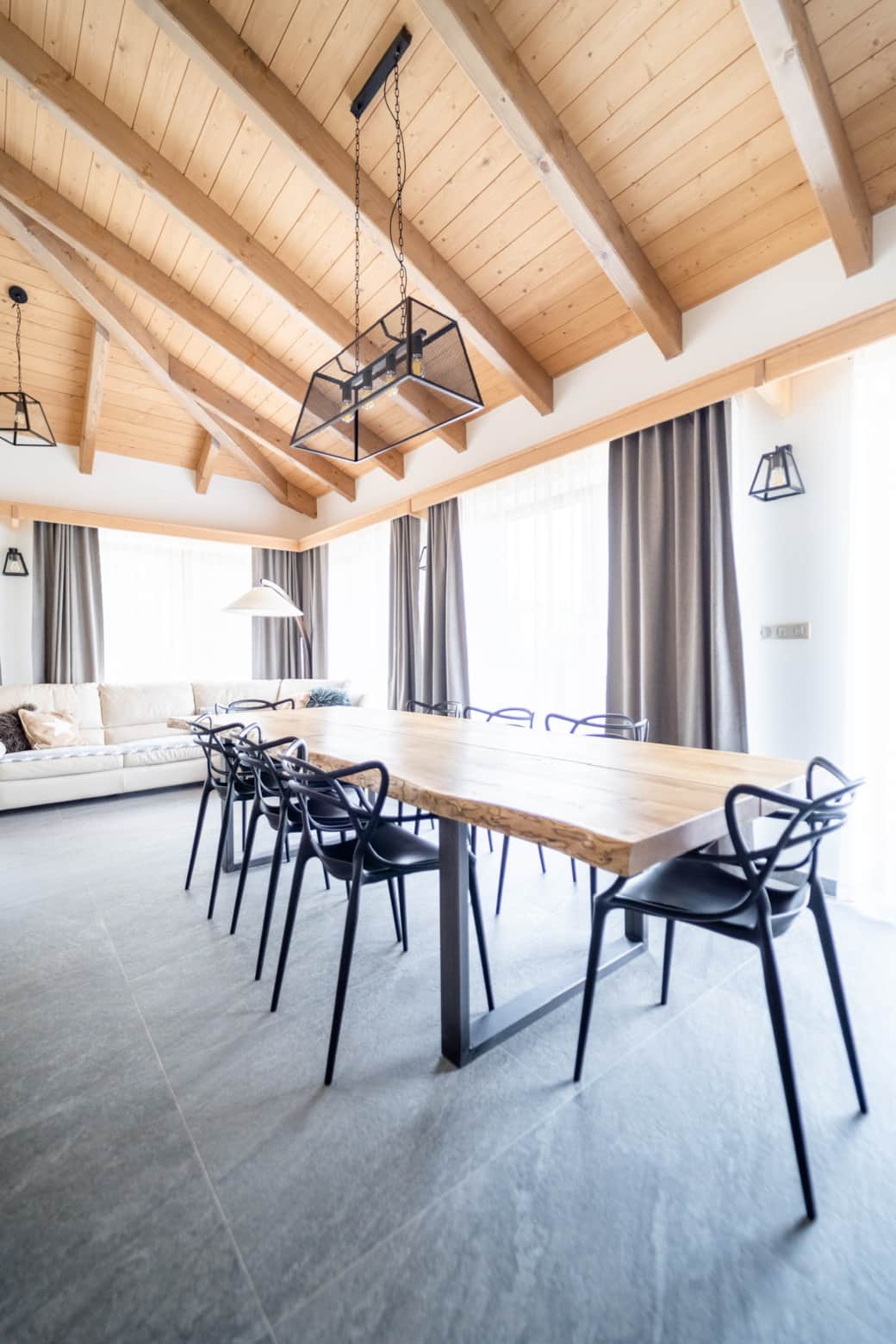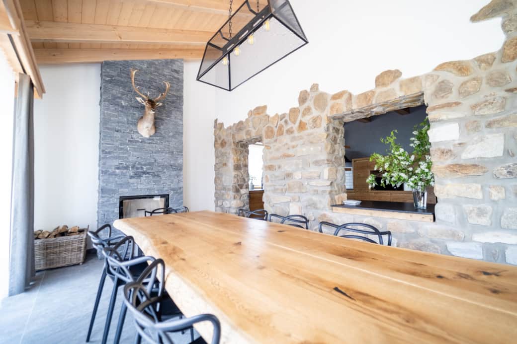 Grand Chalet avec 2 chambres + alcove avec 2 salles de bain et WC, un grand salon avec cheminée, une cuisine équipée, un espace sauna et douche. En extérieur, un patio abrité, parking, une air de jeux et un barbecue ainsi qu'une terrasse en bois avec Jacuzzi, salon et transats.